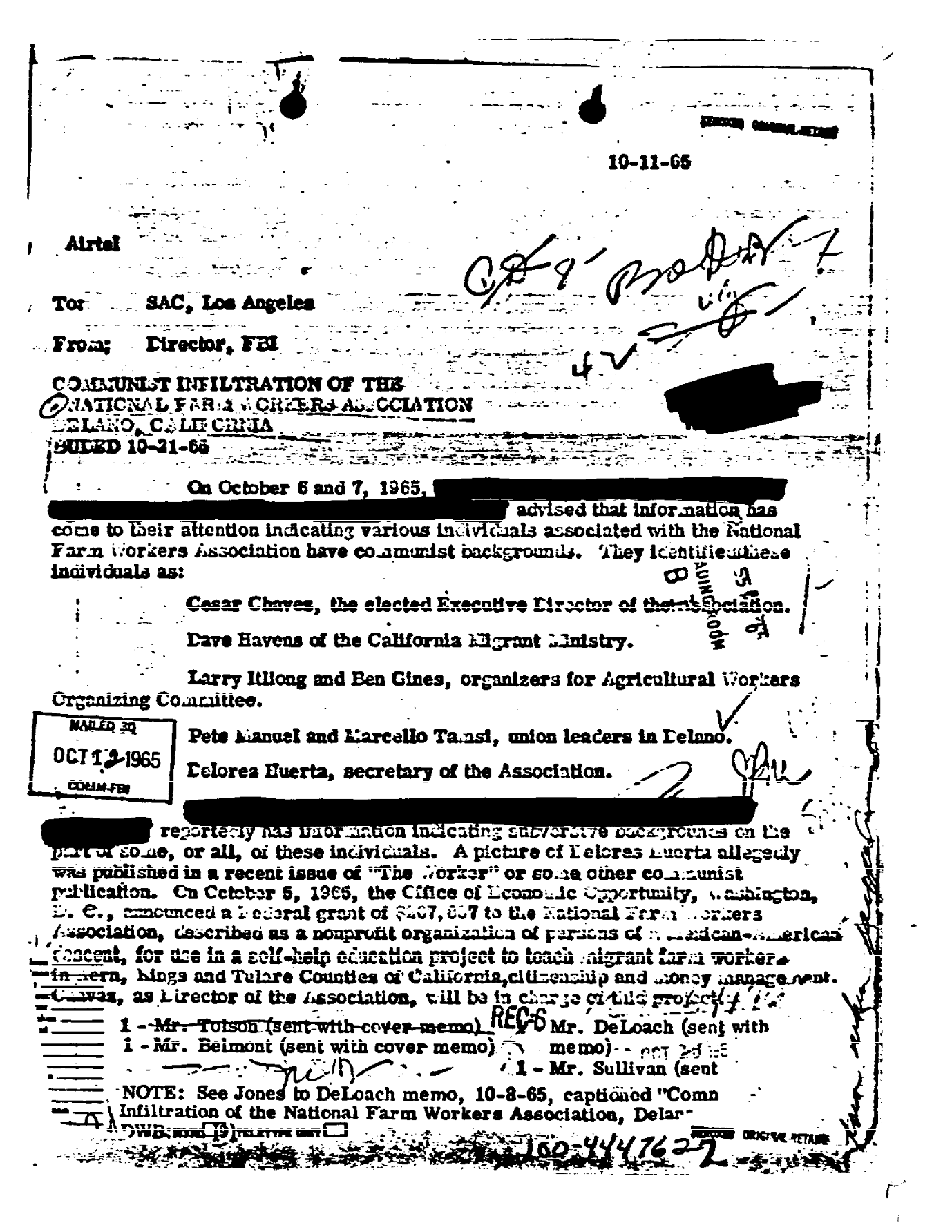 FBI investigation of Cesar Chavez and NFWA based on communist allegations, 1965.